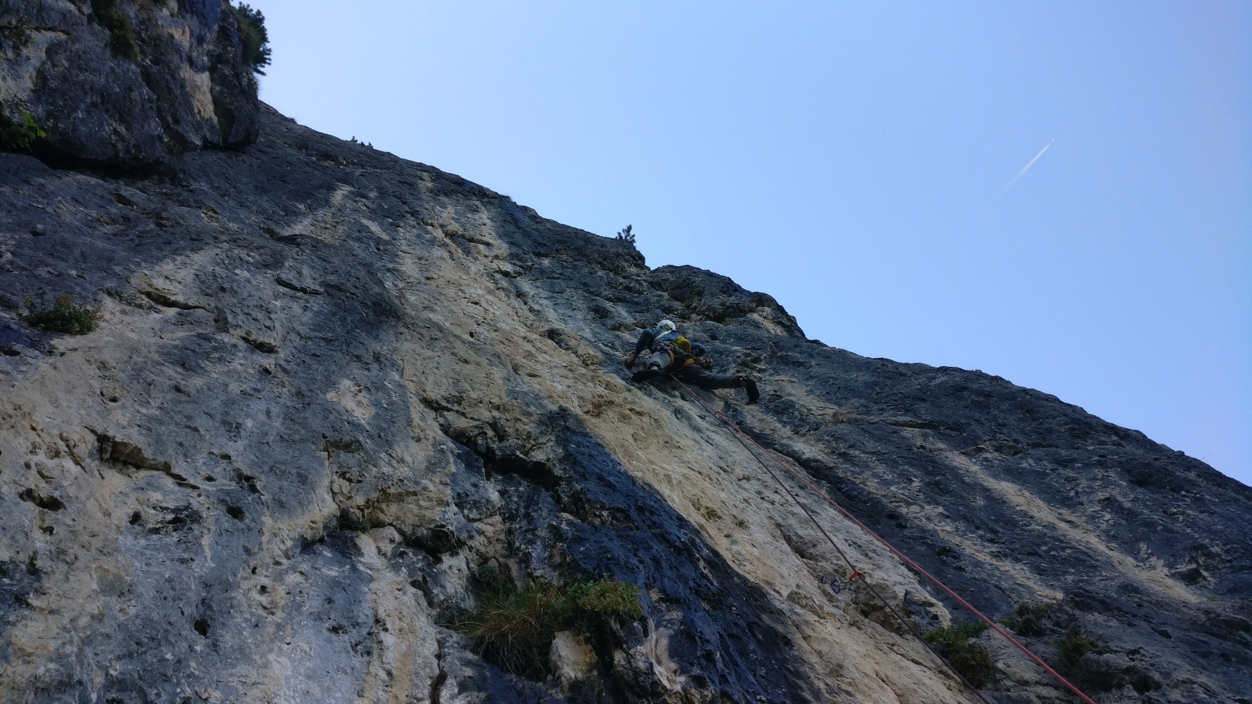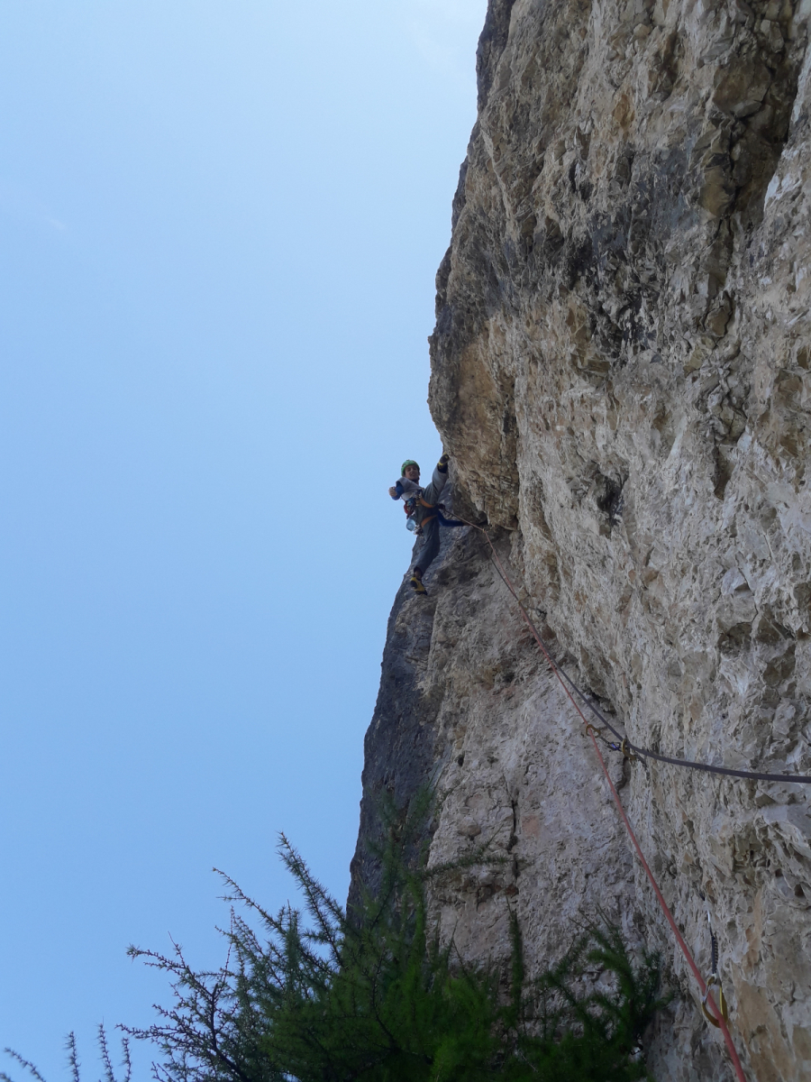 Am nächsten Morgen zeigte sich das Wetter von seiner besten Seite und auch ein Nachmittagsgewitter schien laut der Wettervorhersage unwahrscheinlich. Da Felix mit Zug und Bus aus Meran ankam, erreichten wir erst relativ spät den Einstieg. Die erste Seillänge führte uns durch Latschen und Grasbüschel auf ein Band. Felix fühlte sich bereit für die kommende Seillänge und so stieg er mit Friends bewaffnet in die mit Rissen durchzogene senkrechte Wand. Er bewältigte die durchaus anspruchsvolle Seillänge und baute nach einem Quergang auf einen großen Felskopf Stand. Die erste Schlüssellänge lag nun vor uns.