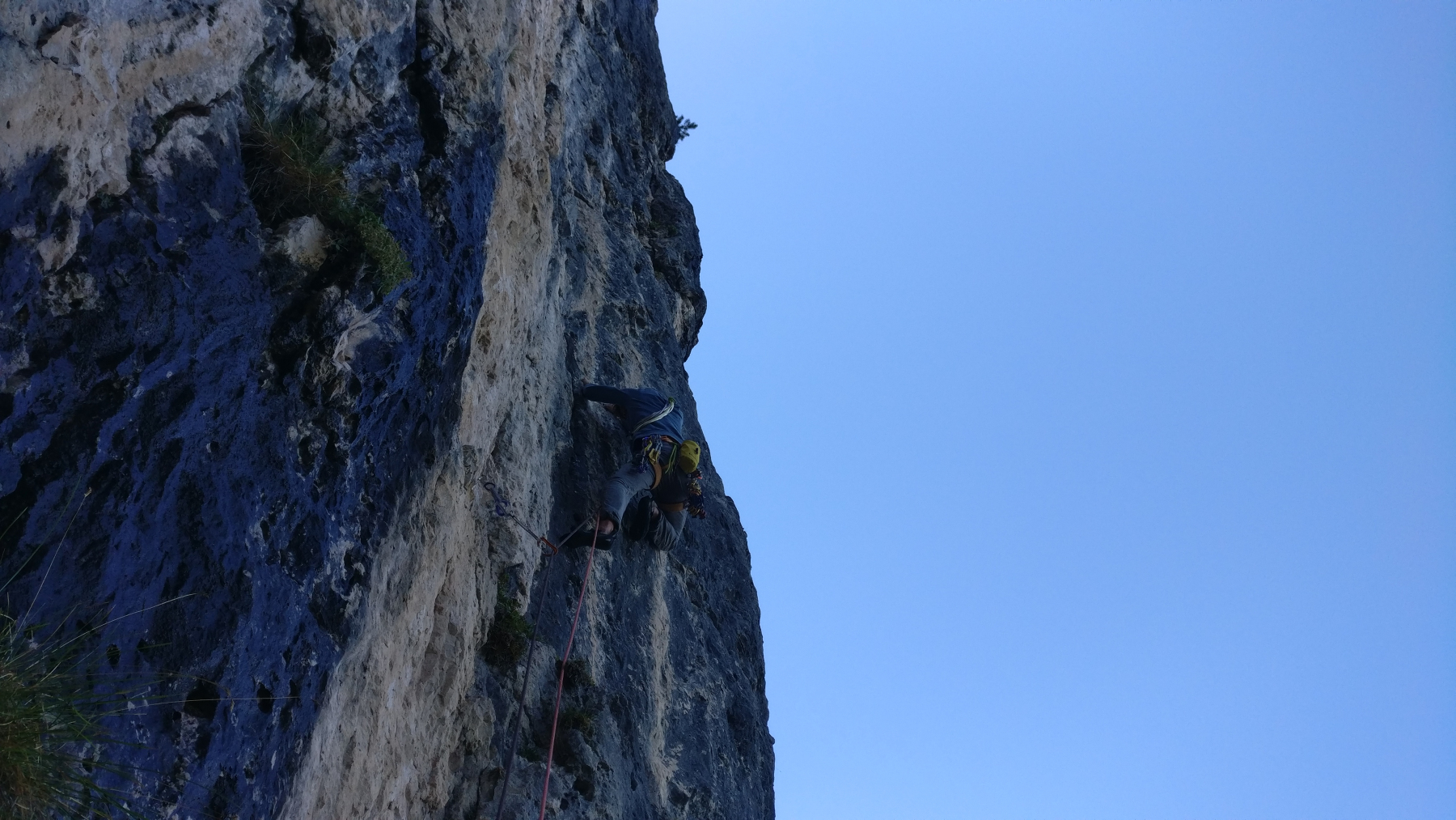 Von dort führte eine lange Seillänge im 5. Grad bis zum Band vor der Schlüsselstelle. Langsam kletterte Felix durch das brüchige und extrem schwierig abzusichernde Gelände. Beim Nachklettern wurde mir bewusst wie gefährlich diese Länge war, denn wohl kaum eine Zwischensicherung hätte einen Sturz gehalten und der Stand darunter war auch nicht bombe.